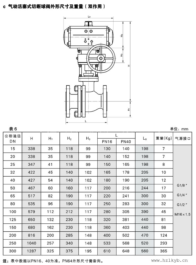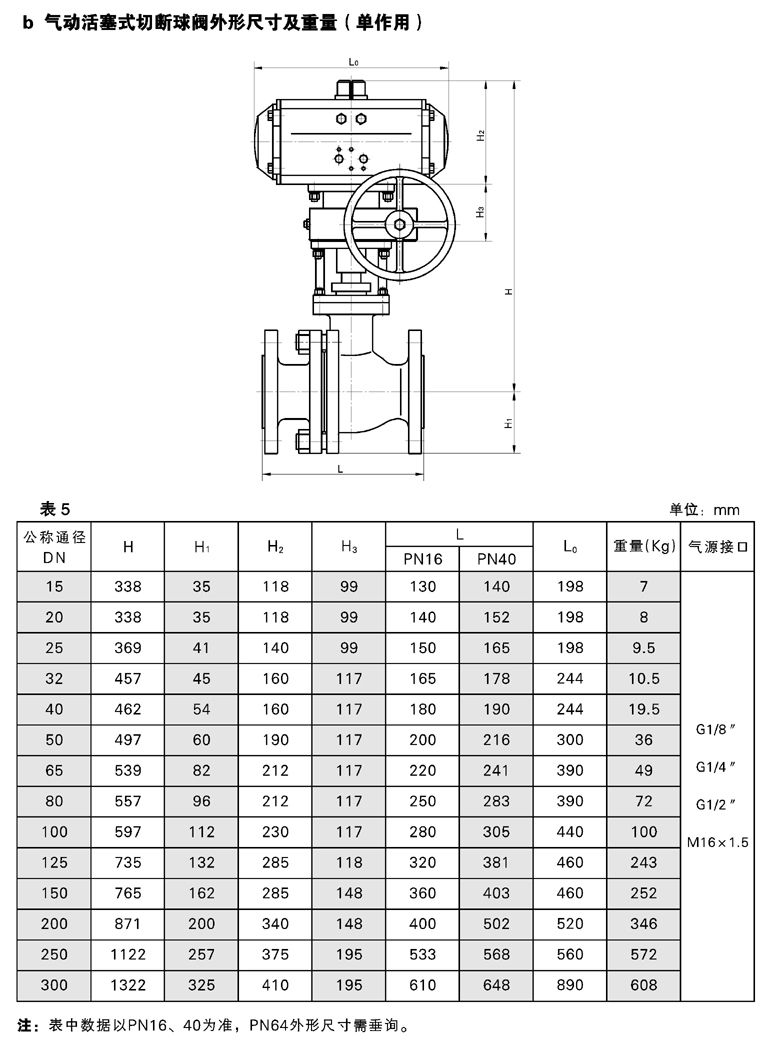 五、气动球阀的扭矩:六、气动球阀的外形尺寸(单作用、双作用):