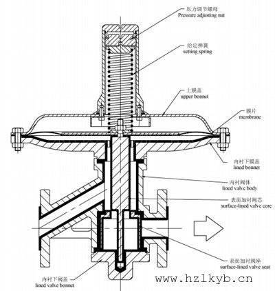 ZZVPF-16K储罐氮封装置衬氟泄氮阀是不需要任何外加能源的,利用被调介质自身能量既能实现自动调节的执行器产品。该阀有普通型阀体结构和内衬四氟型种,如下图所示为(普通型泄氮阀衬氟泄氮阀结构图)